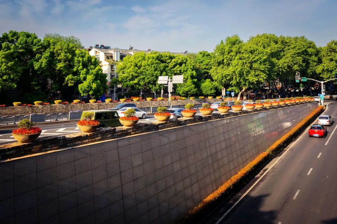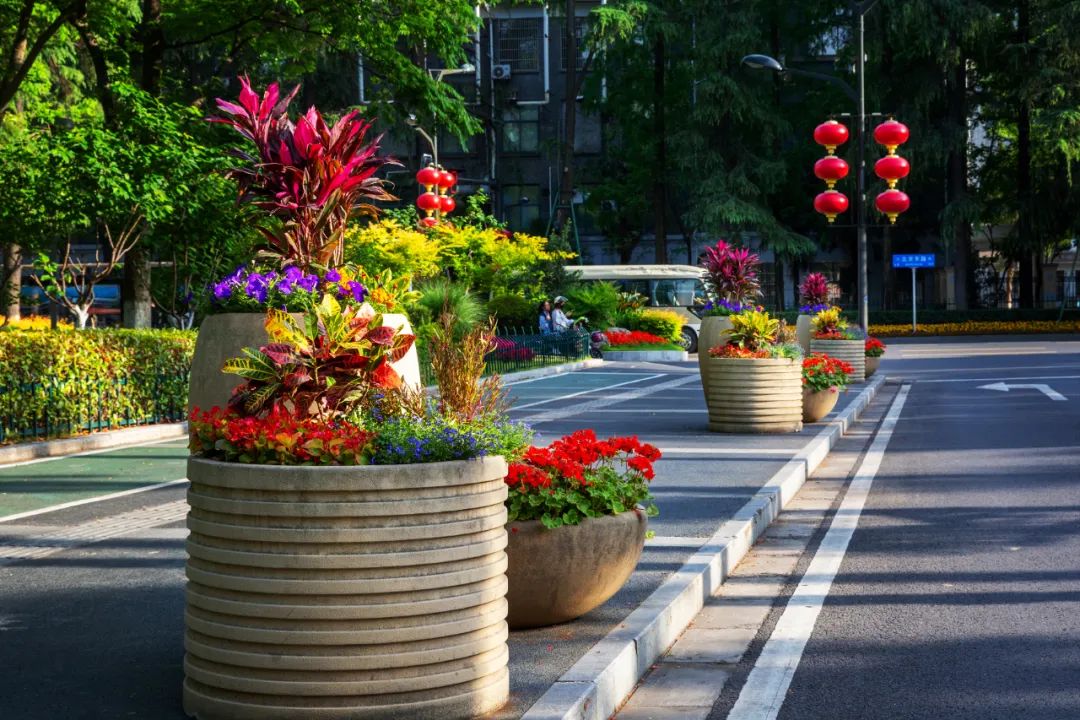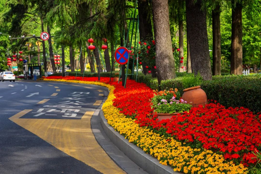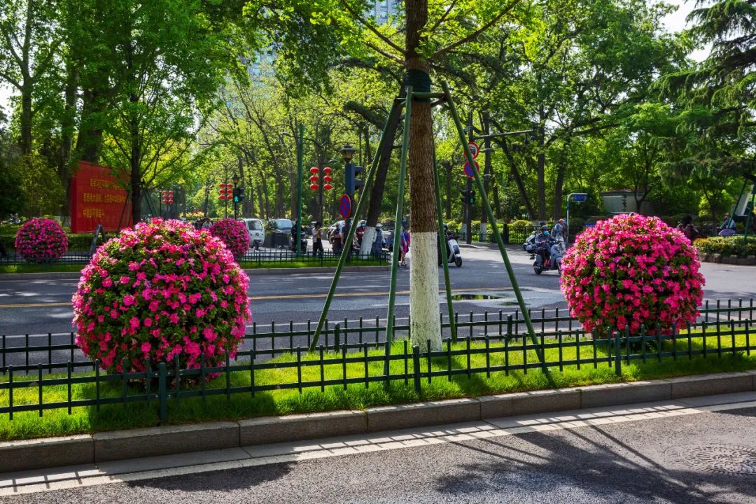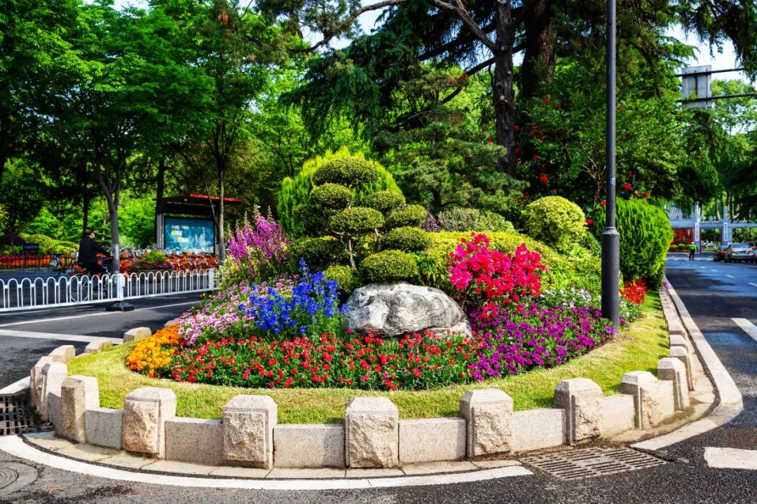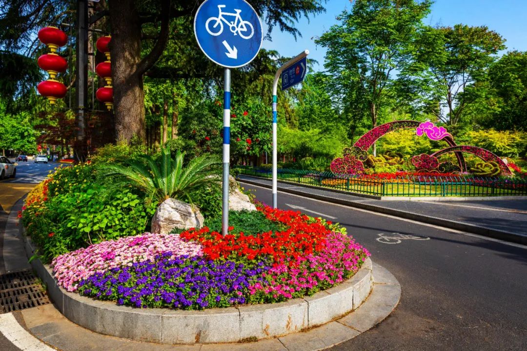 對(duì)市府門前路、長(zhǎng)江路、九華山站、荔枝廣場(chǎng)、中山門城墻等重要節(jié)點(diǎn)容器花箱、花球、燈桿掛花及新街口東北角綠地進(jìn)行花卉布置,選用朱蕉、羽扇豆、毛地黃、天竺葵、桑貝斯鳳仙、金雀、澳洲朱蕉、變?nèi)~木、四季海棠、鼠尾草、歐石竹、垂掛牽牛等花卉,以色彩鮮明、層次豐富的設(shè)計(jì)感,裝扮城市街角,營造濃厚的節(jié)日氣氛。