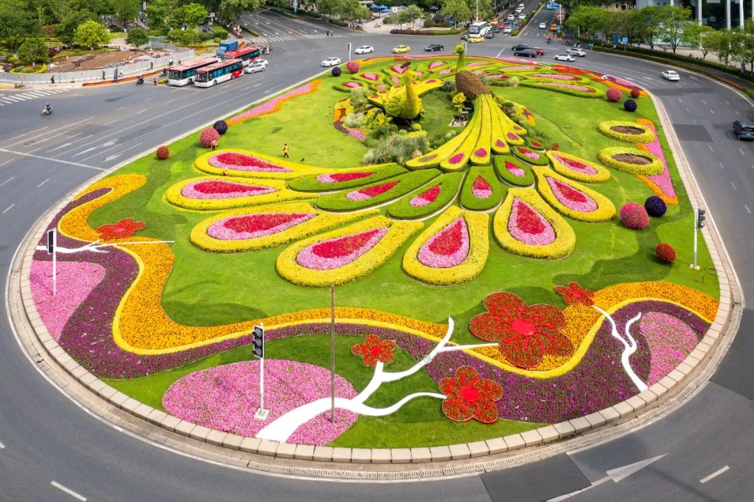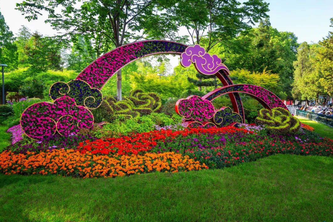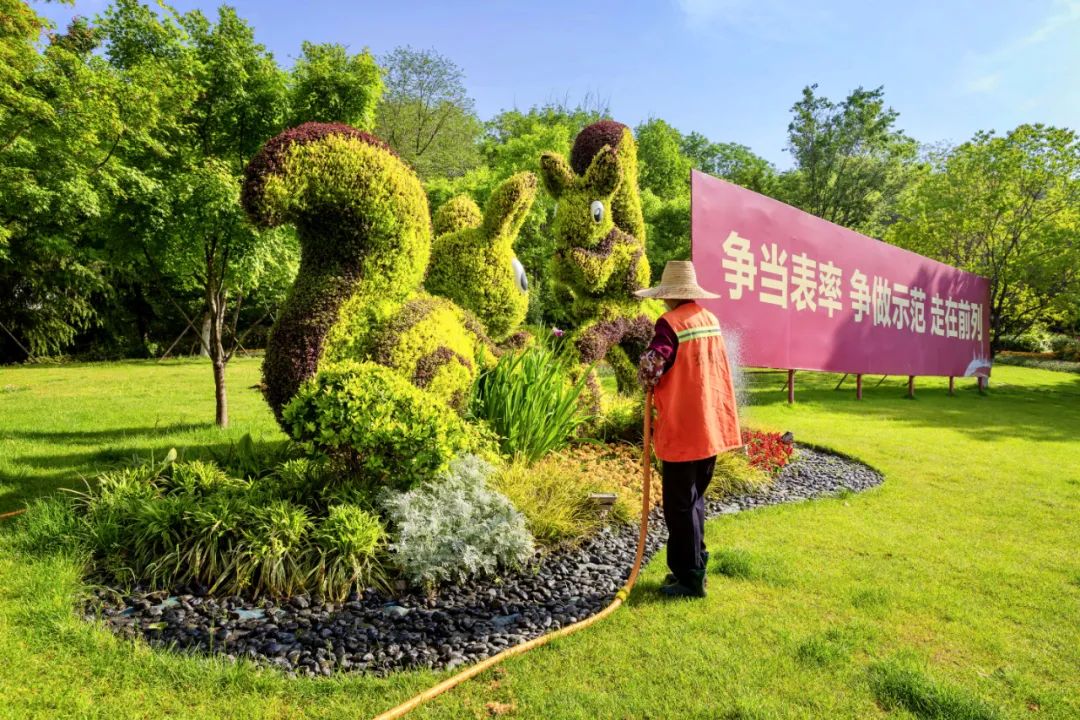和平公園東園“幸福之門”、西園“飛躍之門”、九華山南坡松鼠等綠雕花境布置,花姿招展、層次錯(cuò)落的空間感和情景變化,步移景異、栩栩如生。