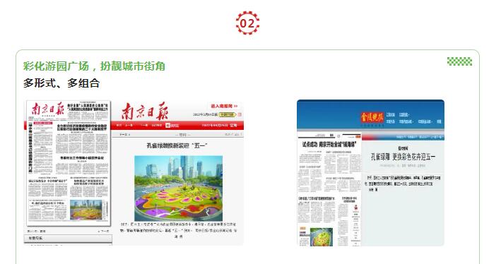鼓樓中心廣場(chǎng)孔雀綠雕換上新妝、“五福梅花”和12個(gè)錯(cuò)落的幸?;ㄇ蛞陨是逍碌幕ɑ懿贾茫瑺I造出“‘梅’好金陵”的春天氣息。4月25日,《南京日?qǐng)?bào)》、《金陵晚報(bào)》等多家媒體對(duì)鼓樓中心廣場(chǎng)孔雀綠雕迎五一換妝進(jìn)行報(bào)道。